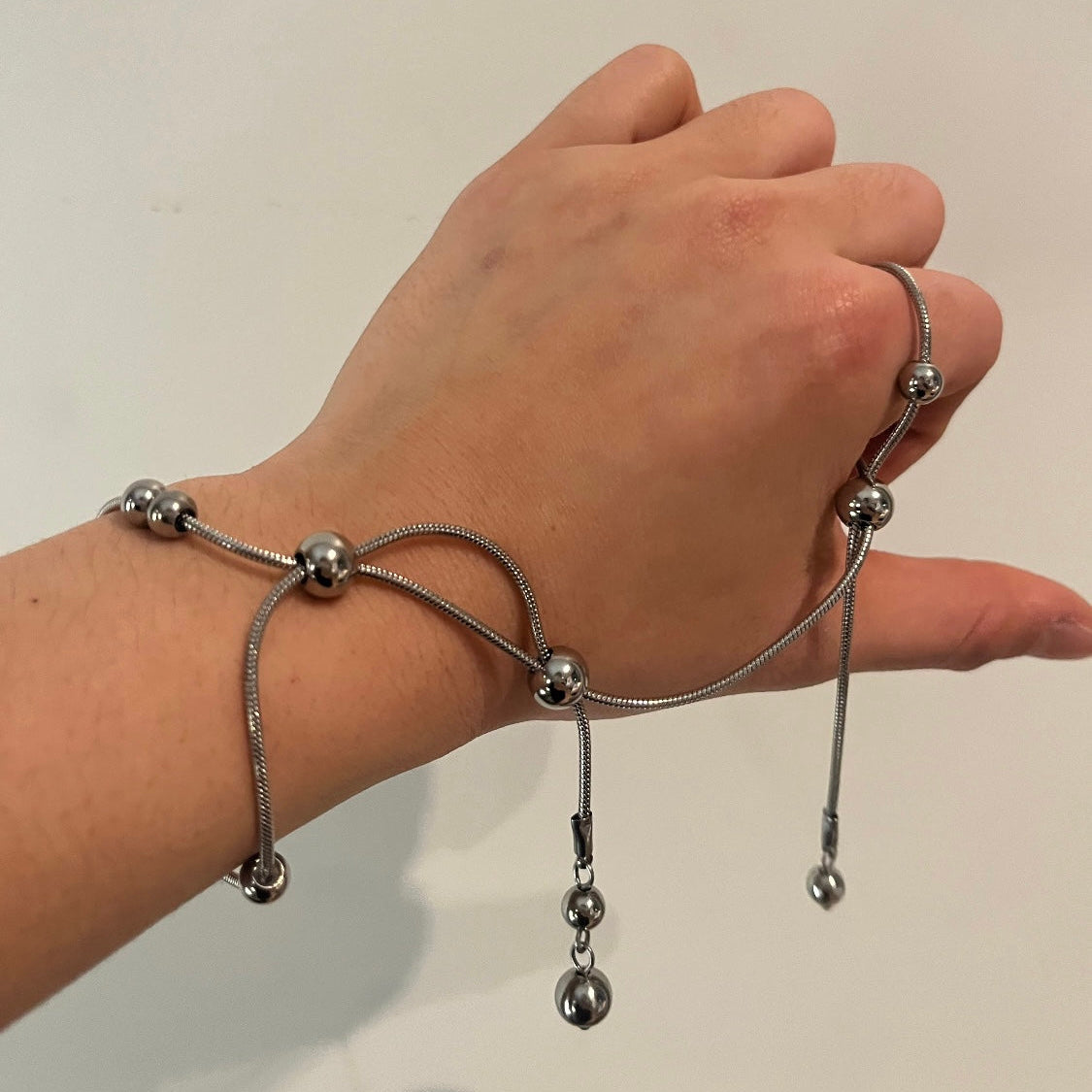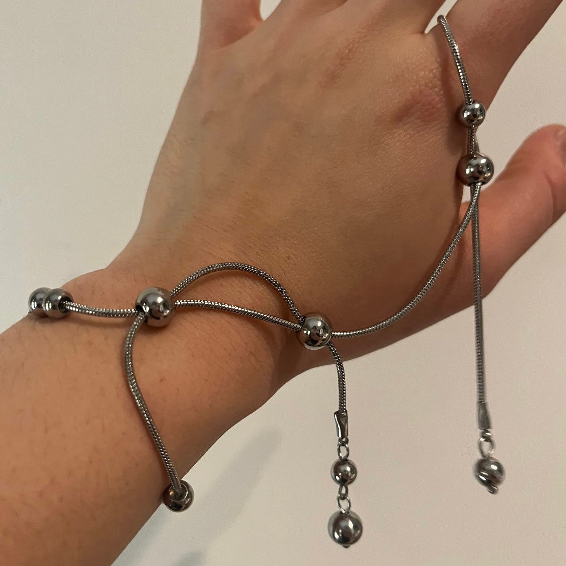 Snake chains, metal pearls, and steel sliders, inspired by the movement of water.