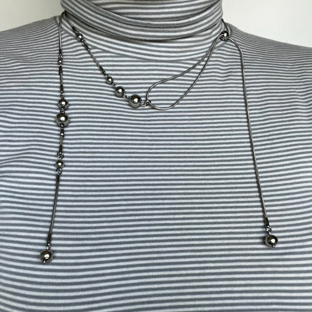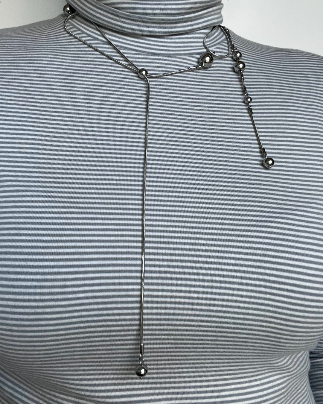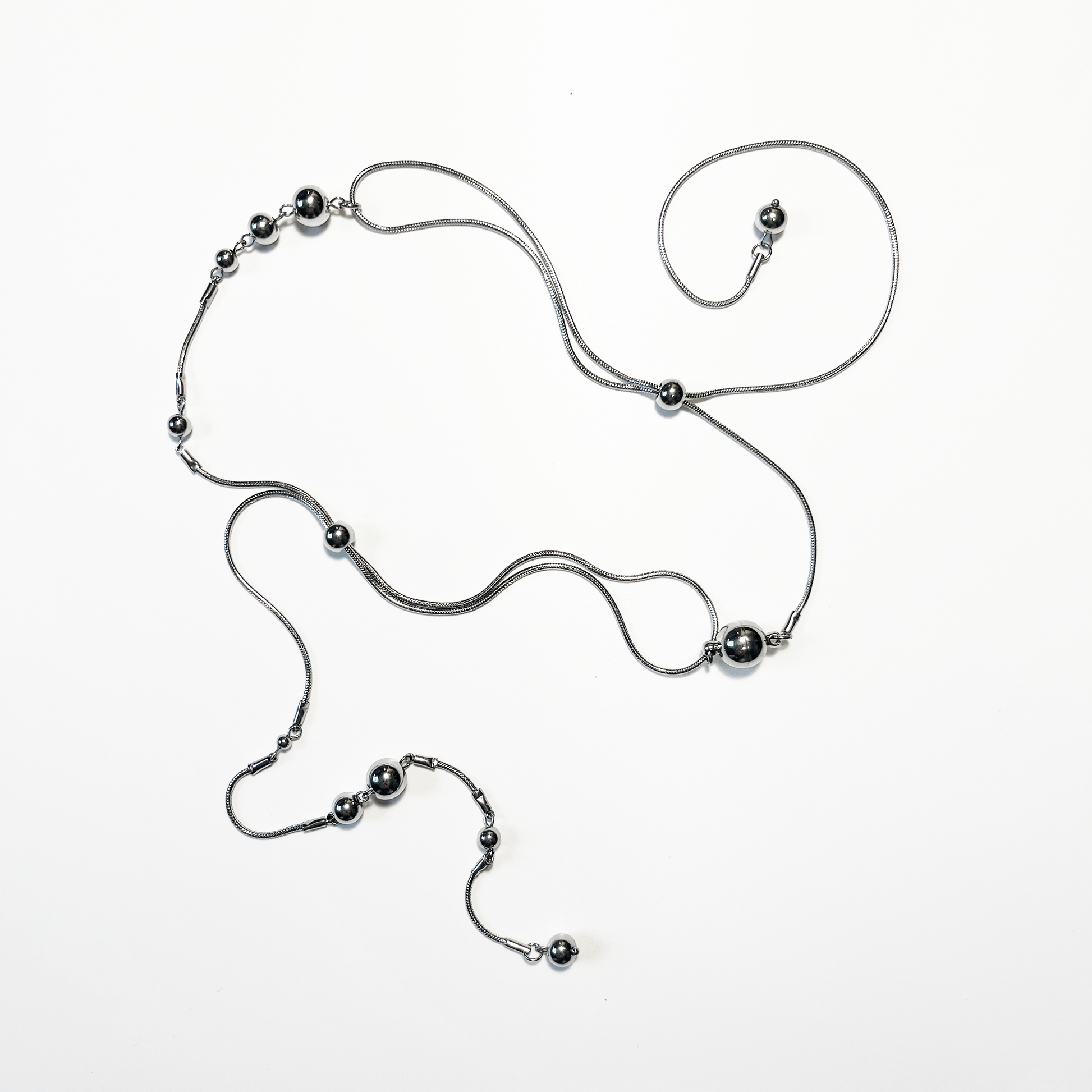 Snake chains, metal pearls, and steel sliders, inspired by the movement of water.