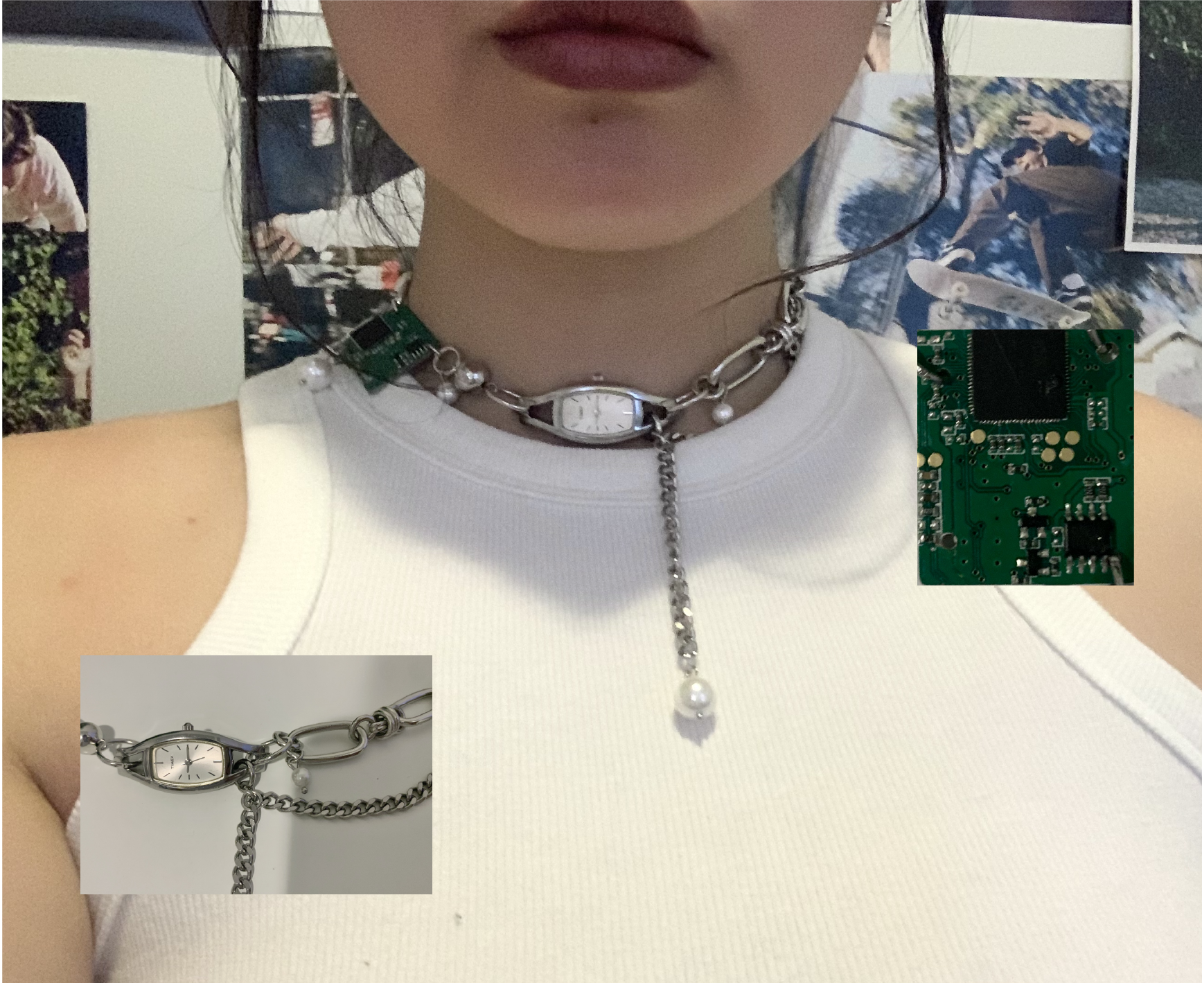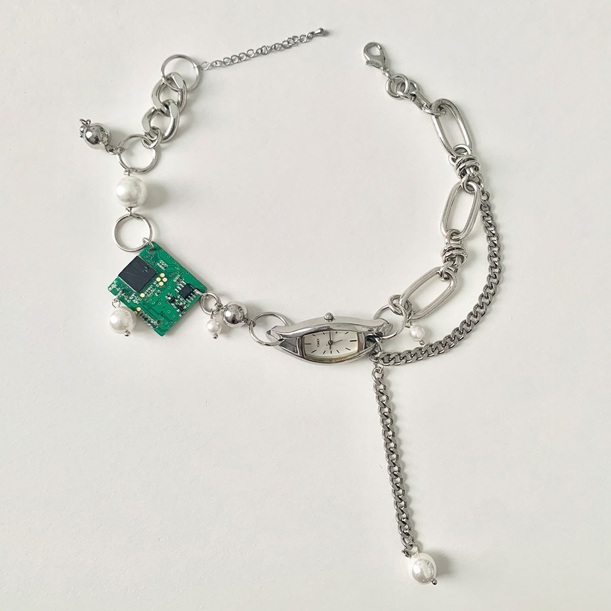 Upcycled Timex watch face and circuit board, faux pearls, silver and glass beads, knotted and curb chain
