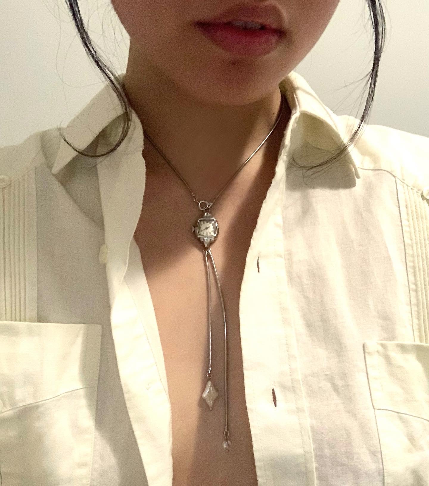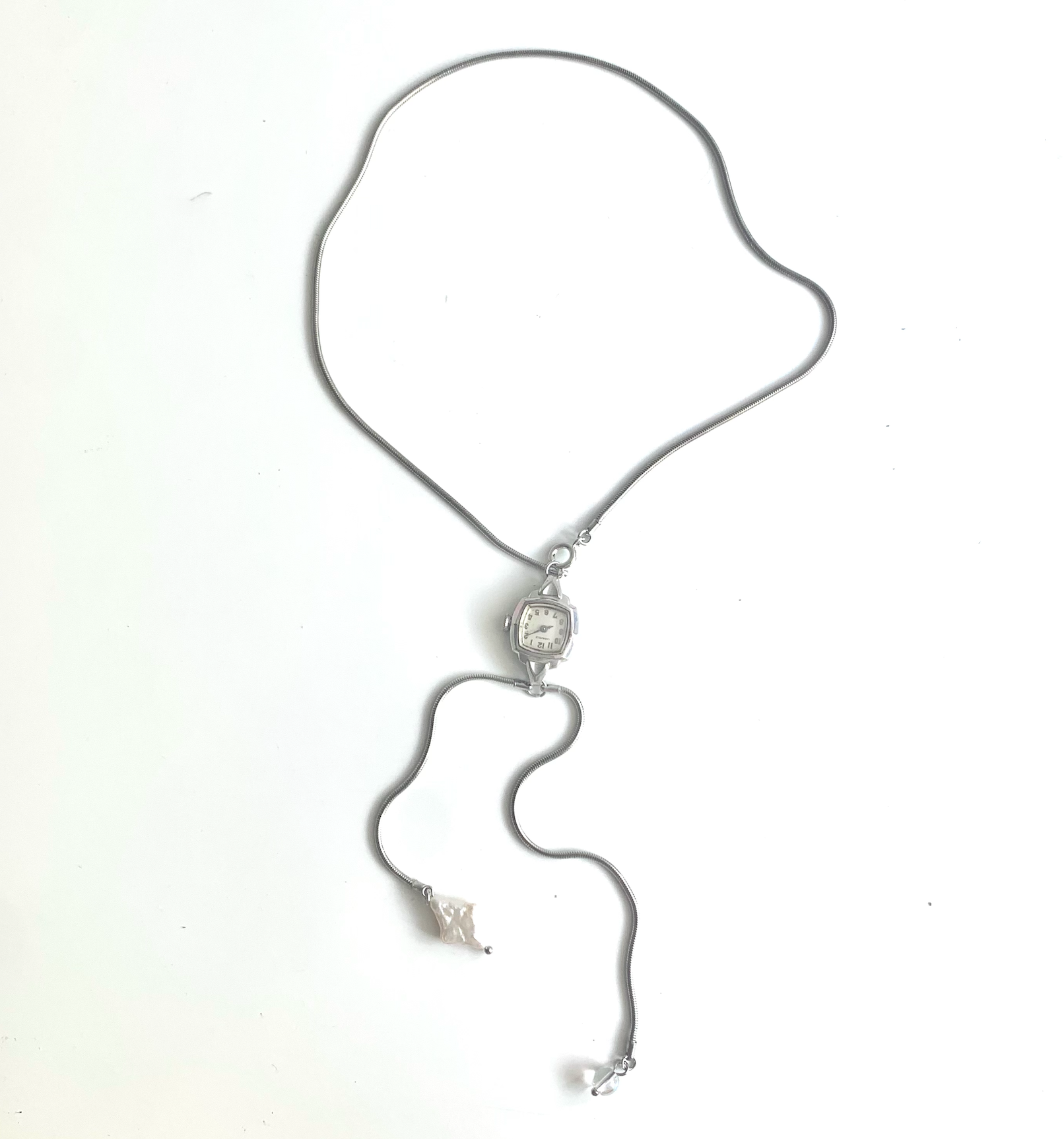 Upcycled Benrus watch face (slight discoloration due to age), freshwater pearl, glass bead, brass snake chain